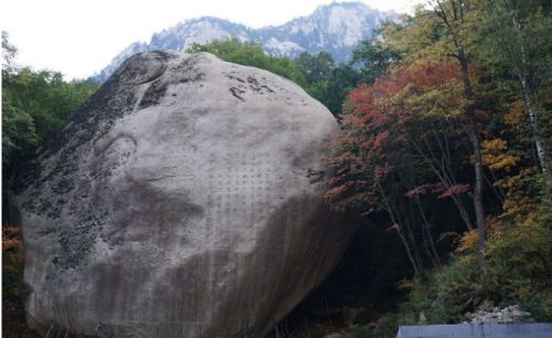 雾灵山有一块闻名遐尔的人文景观“大字石”,是明代摩崖石刻,号称“京东第一碑”。 “大字石”地处海拔1050米的雾灵山阴坡,巨石高28.4米,宽30.8米,正中镌刻“雾灵山清凉界”六个大字,每字约4平方米,豪放洒脱,苍劲有力。在六个大字左侧,竖刻90多个中号字,每字约45厘米见方,内容是“兵部尚书谭纶,分守游击任良相,阅视侍郎汪道昆,分守游击李如梗,总都侍郎刘应节,巡抚都御史杨兆,总部督戚继光,兵部郎中左兴,户部郎中侯治国,兵部副史王一鹗,协守部督张臣。”落款为“明万历三年五月初五日,曹家路,永平李逢时刻石。” 在这块大字石周围,还分布着“霧靈真境”、“羊腸鳥道”、“發”、“霧靈山”等摩崖石刻群,其镌刻年代也应在明代。雾灵山在明代沦为“边外弃地”后,由于长城的阻隔,游览雾灵山并非易事,而雾灵山的北麓接近长城内的驻军和村庄,于是人们通过曹家路,越过长城关口从大沟登山就成了一条便捷之路,也因此在大沟附近留下了大字石和其他摩崖石刻群。